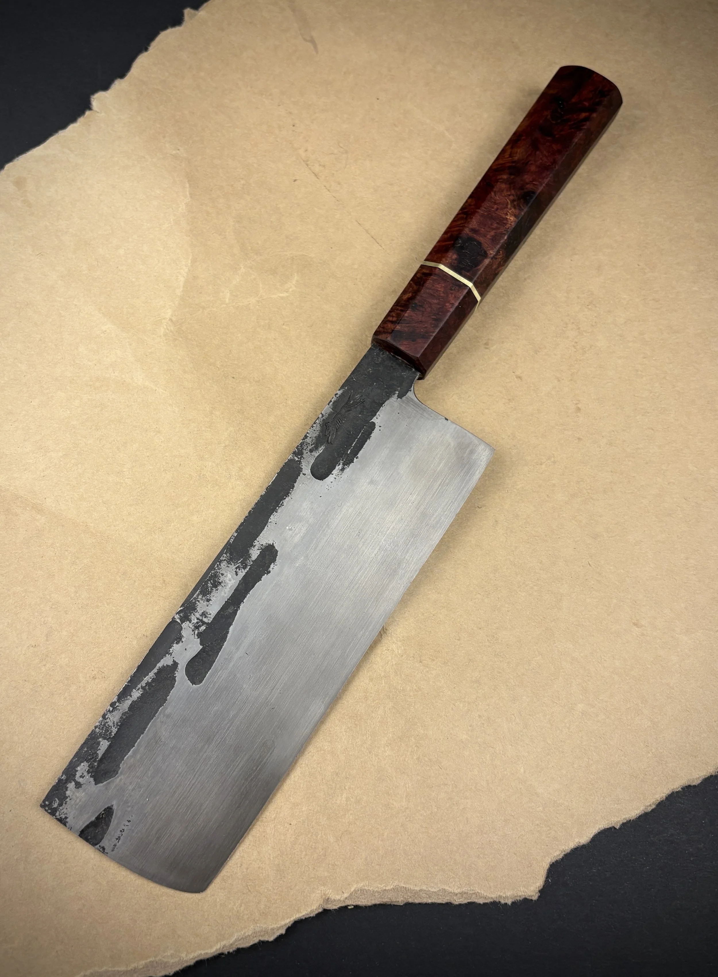 Hand forged nakiri made with 1095 high carbon steel. Handled with some stunning stabilised Pohutukawa burl. Blade is 16cm from tip to heel.